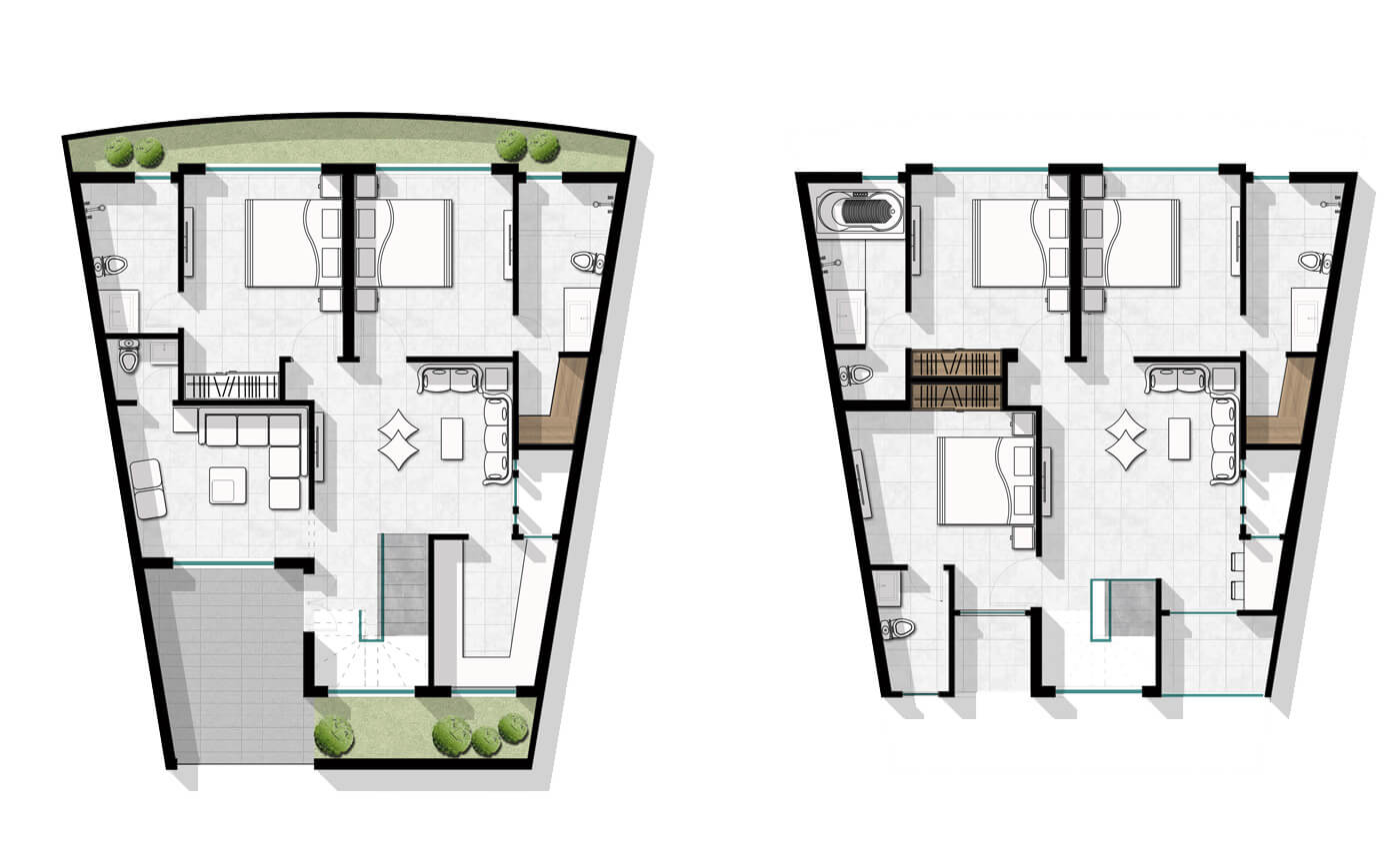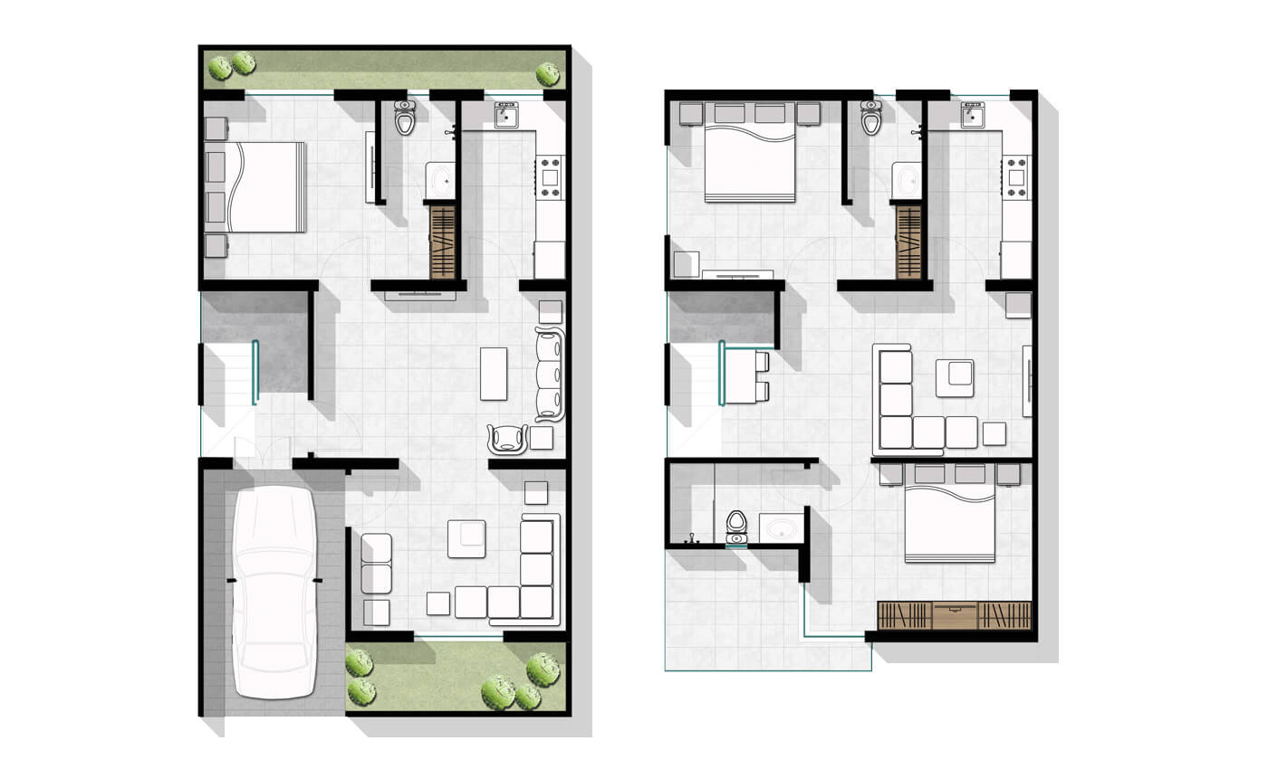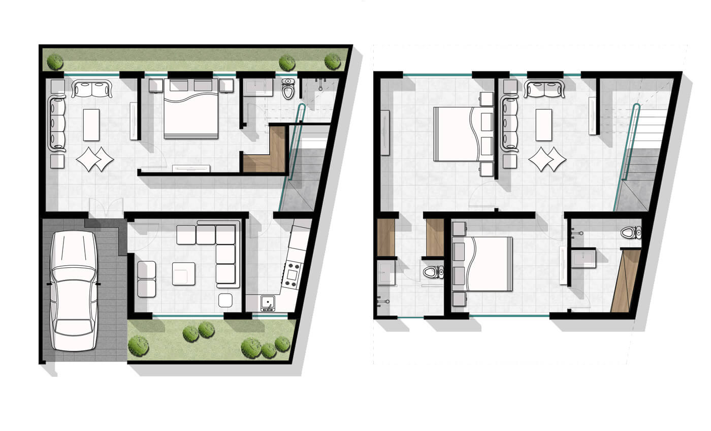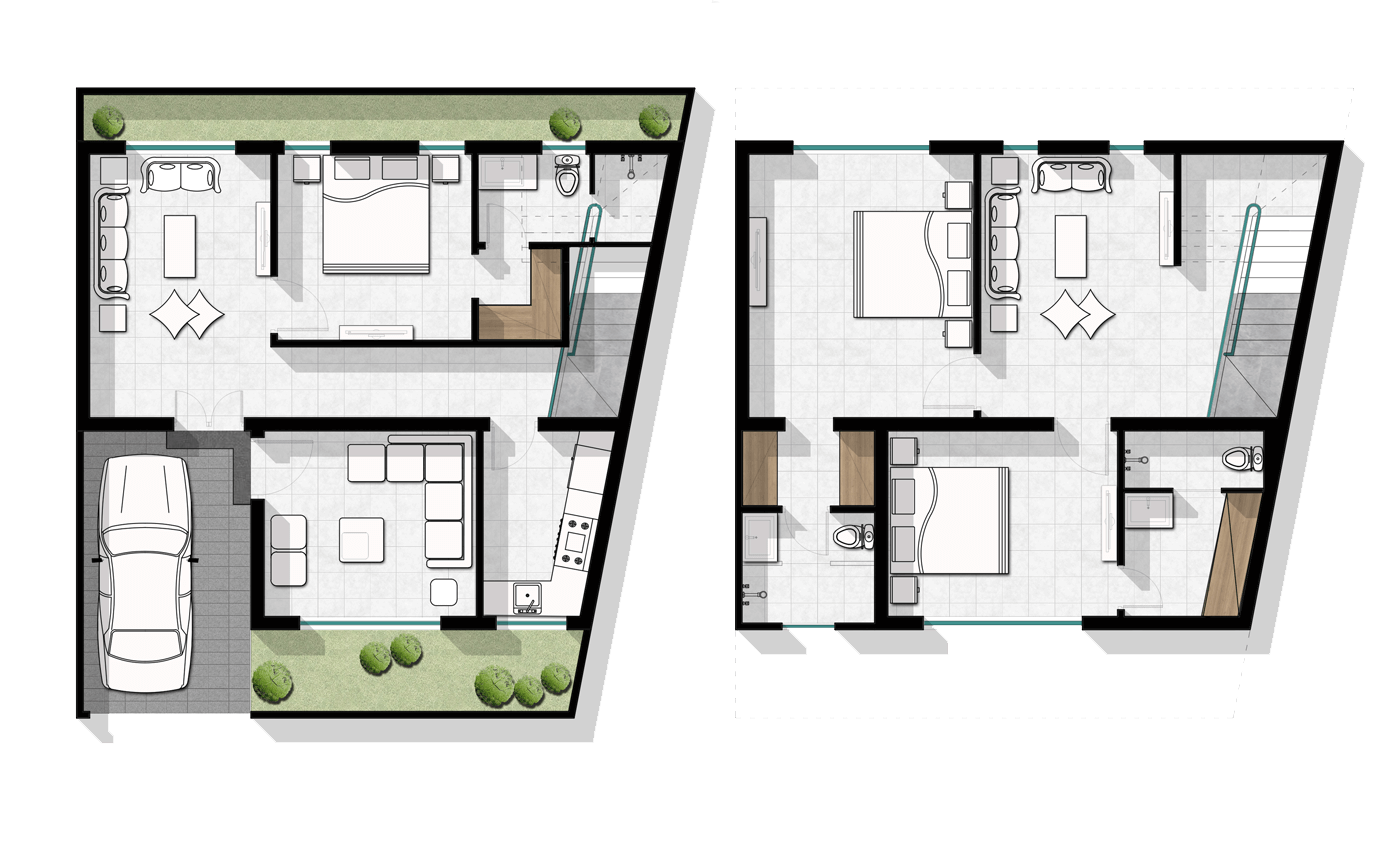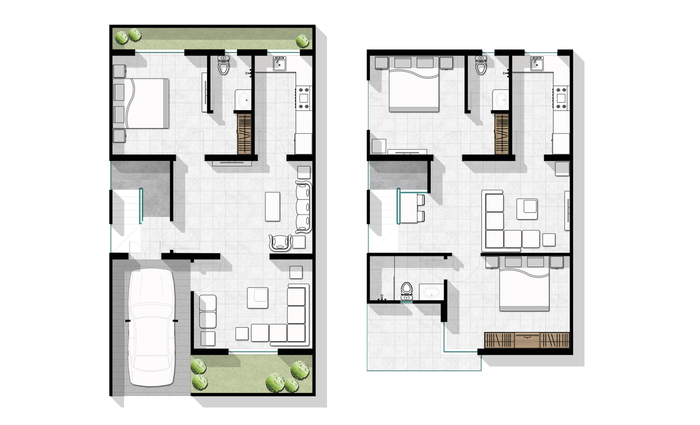 To offer personalisation of the homes, we created 13 types of plans where the clients could choose options for façades and layouts as per their needs. It is important to mention that each elevation was designed uniformly. Therefore, a modern facade comes with modern interiors and a traditional one with traditional interiors.